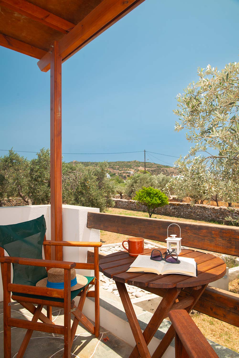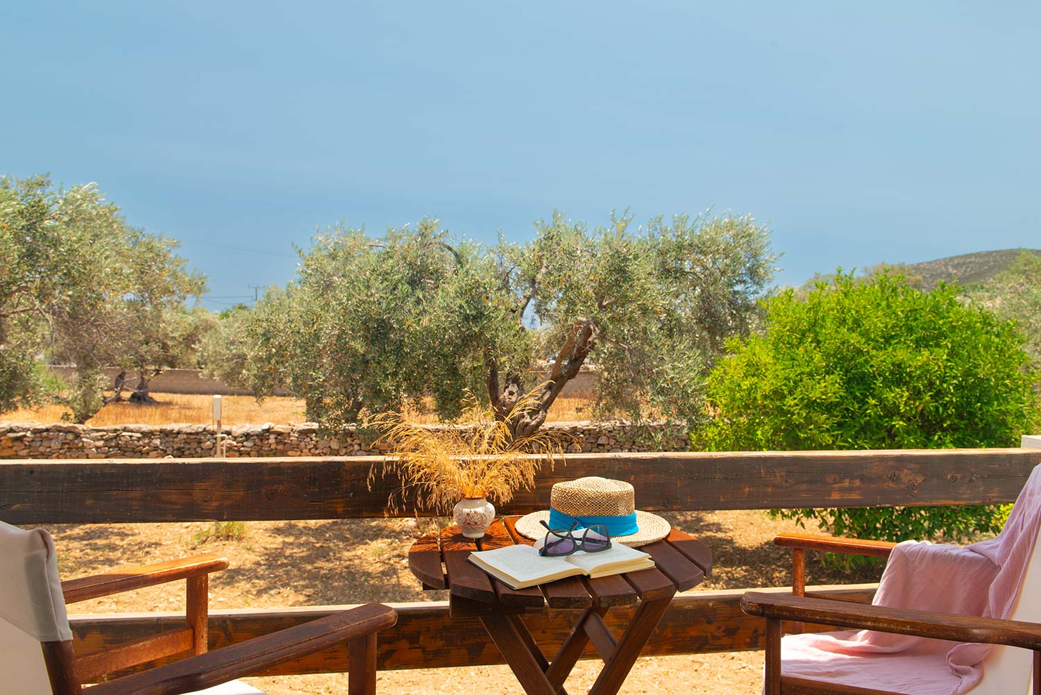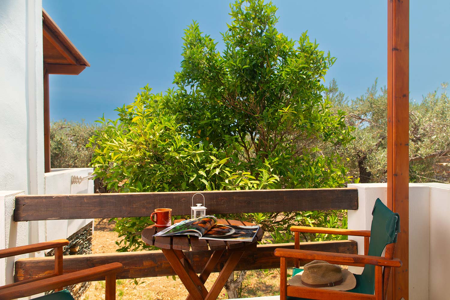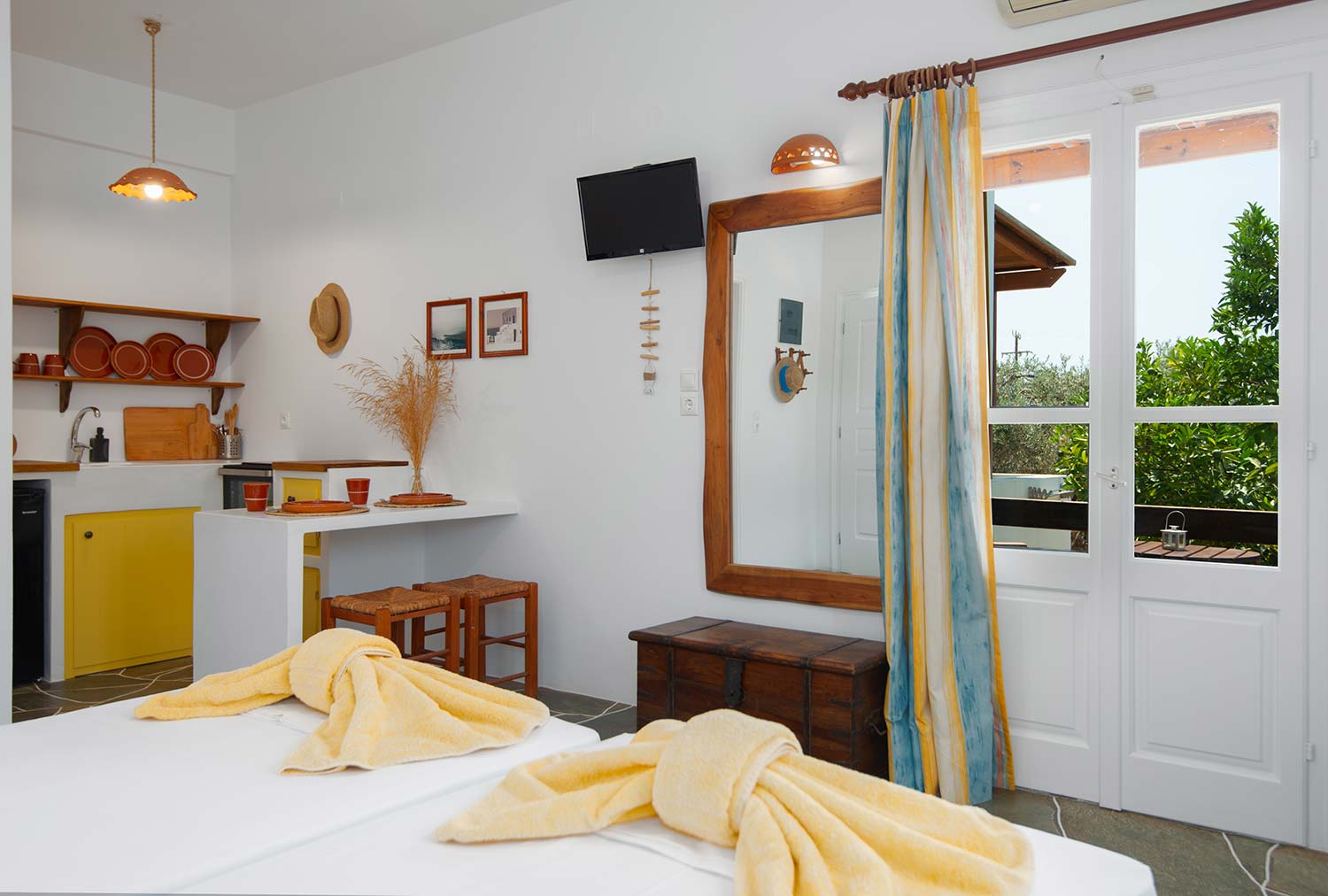 Surrounded by olive trees and Aegean plants and scents, these studios offer a warm and comfortable stay. They are located on the ground floor and feature a fully equipped kitchen, a comfortable bedroom with single or double beds, a private bathroom, and a balcony with garden views, where you can enjoy your coffee or relax in the cool breeze. They can accommodate 2 or 3 people, as some have a living room with a built-in sofa. Ideal for those seeking tranquility, comfort, and authentic hospitality.