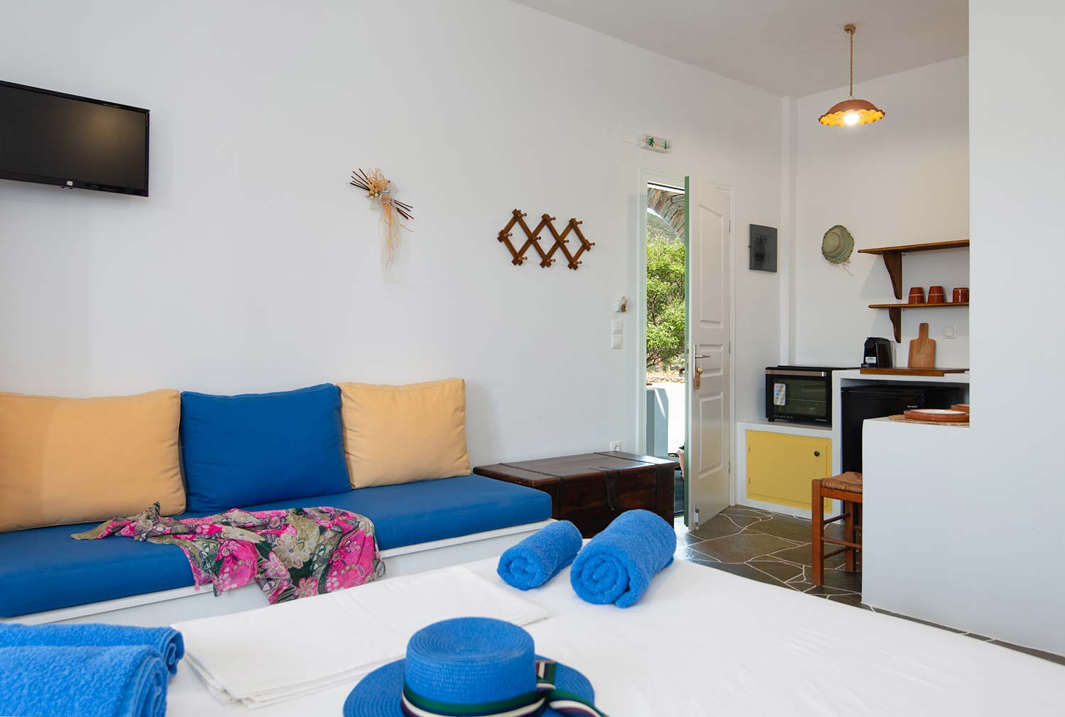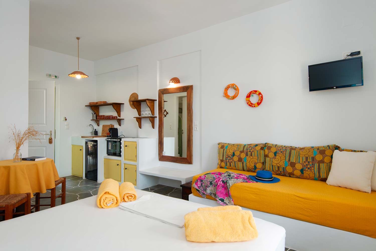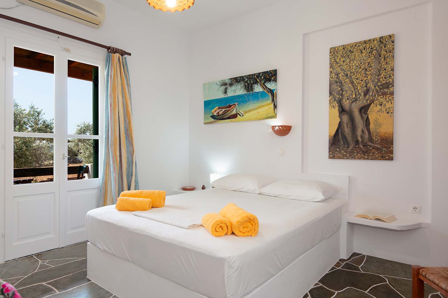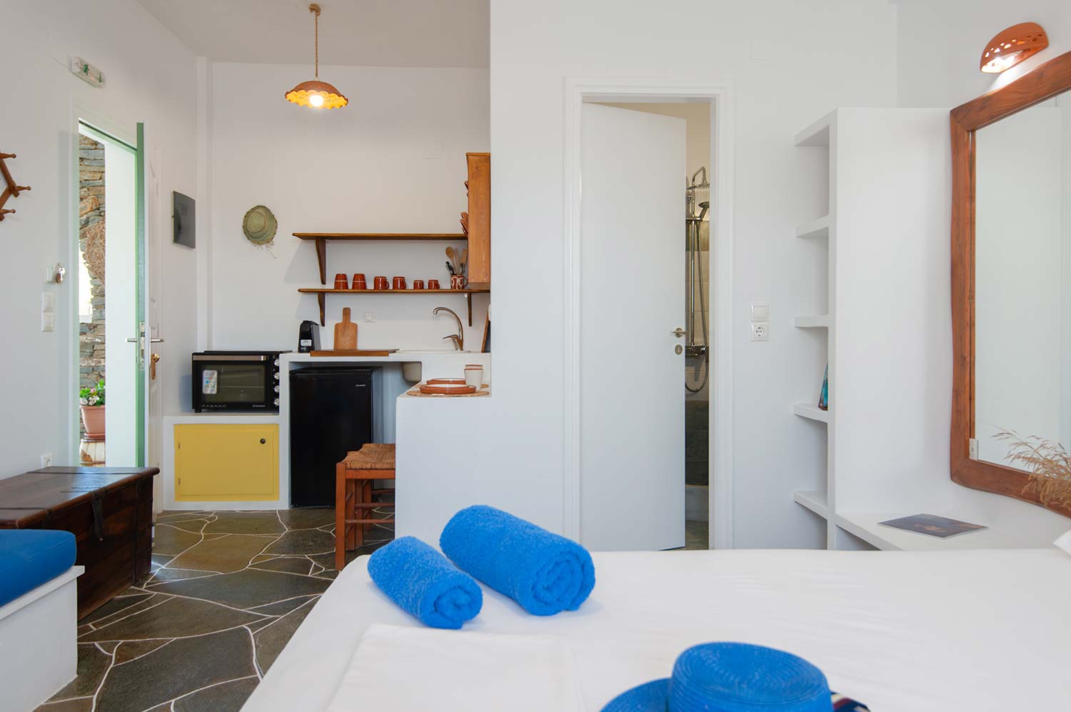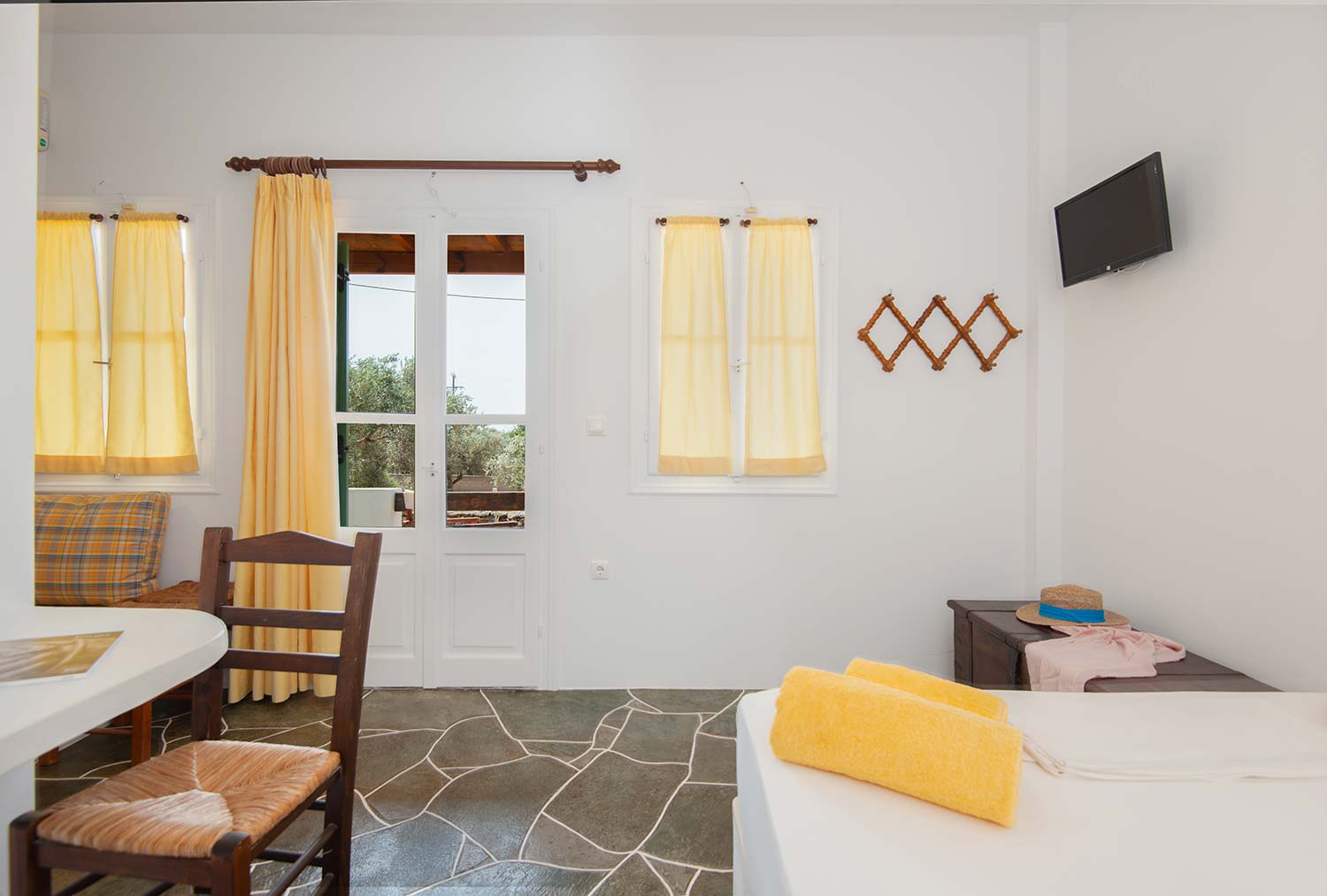 Surrounded by olive trees and Aegean plants and scents, these studios offer a warm and comfortable stay. They are located on the ground floor and feature a fully equipped kitchen, a comfortable bedroom with single or double beds, a private bathroom, and a balcony with garden views, where you can enjoy your coffee or relax in the cool breeze. They can accommodate 2 or 3 people, as some have a living room with a built-in sofa. Ideal for those seeking tranquility, comfort, and authentic hospitality.